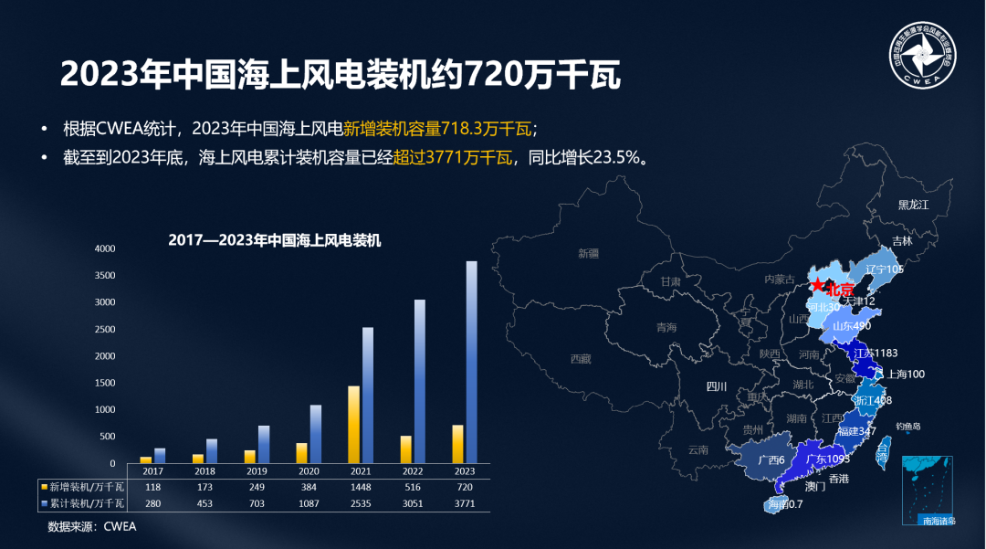 “十四五”前期,我國實(shí)現(xiàn)了海上風(fēng)電穩(wěn)步發(fā)展,CWEA數(shù)據(jù)顯示,2023年度海上風(fēng)電新增裝機(jī)容量718.3萬千瓦,累計(jì)裝機(jī)容量已經(jīng)超過3771萬千瓦,同比增長23.5%。