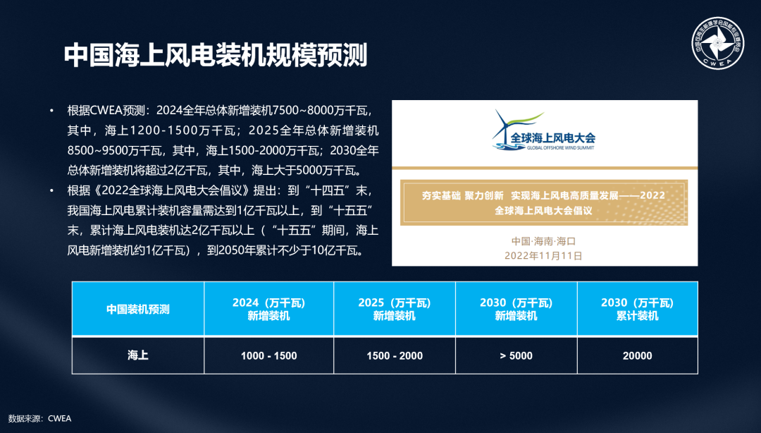 CWEA研究顯示,海上風(fēng)電規(guī)劃發(fā)展?jié)摿薮螅笆奈濉逼陂g,中國沿海地區(qū)海上風(fēng)電規(guī)劃容量約5500萬千瓦。預(yù)計(jì)2024全年總體新增裝機(jī)7500~8000萬千瓦,其中,海上1200-1500萬千瓦;2025全年總體新增裝機(jī)8500~9500萬千瓦,其中,海上1500-2000萬千瓦;2030全年總體新增裝機(jī)將超過2億千瓦,其中,海上大于5000萬千瓦。