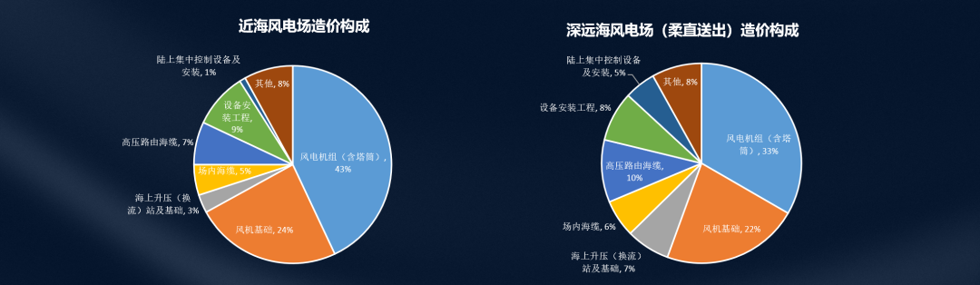 上圖可以看出,近海風(fēng)電場風(fēng)電機(jī)組在總投資中占比最高,隨著海上風(fēng)電向深遠(yuǎn)海開發(fā),設(shè)備投資占比逐步降低,風(fēng)機(jī)基礎(chǔ)等建筑工程占比逐步提升;在漂浮式風(fēng)電場中主要設(shè)備占比已低于風(fēng)機(jī)基礎(chǔ)。另外,在深遠(yuǎn)海風(fēng)電場采用柔性直流輸電后,海上及陸上換流站、高壓海纜路由的占比明顯提高。其中,占比較大的機(jī)組價(jià)格下降幅度較大,2024年5月,華能半島北L場址海上風(fēng)電項(xiàng)目,單機(jī)12-14MW,含塔筒的折合單價(jià)已經(jīng)到了3000元左右每千瓦左右的價(jià)格。