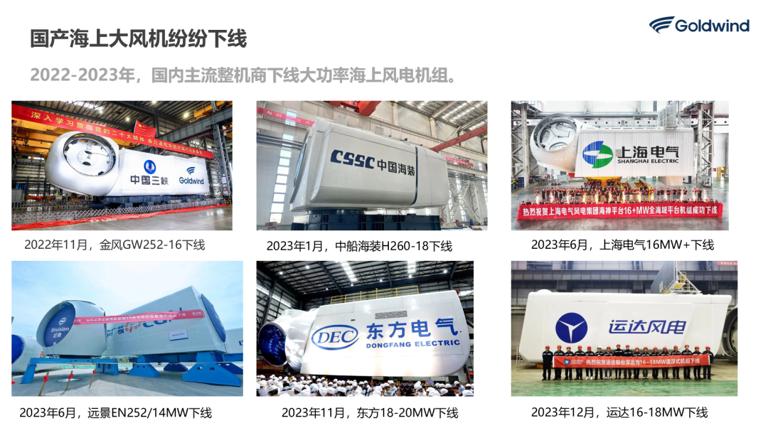 2021年海上風(fēng)電機(jī)組主流已經(jīng)在6MW到7MW水平,8MW到10MW機(jī)組已經(jīng)投入了試驗(yàn)運(yùn)行。2022年海上風(fēng)電機(jī)組主流到了8MW左右,10MW到11MW機(jī)組已經(jīng)開始投入運(yùn)行了。2023年的12-13MW機(jī)組達(dá)到批量應(yīng)用, 2022年11月,金風(fēng)16MW機(jī)組下線了,到2023年6月在福建平潭吊裝完成,同時(shí)2023年中國海裝的18MW機(jī)組已經(jīng)下線,明陽的18MW機(jī)組也已經(jīng)下線,10月份明陽的22MW的機(jī)組,還有20MW的風(fēng)電機(jī)組都在持續(xù)下線。6月5日,由東方電氣自主研制的首臺(tái)18兆瓦半直驅(qū)大功率海上風(fēng)電機(jī)組,在廣東省汕頭市風(fēng)電臨海試驗(yàn)基地成功完成吊裝,是當(dāng)前全球已安裝的最大功率等級(jí)海上風(fēng)電裝備,標(biāo)志著全球已安裝的海上風(fēng)電機(jī)組功率等級(jí)邁入新的里程碑。
